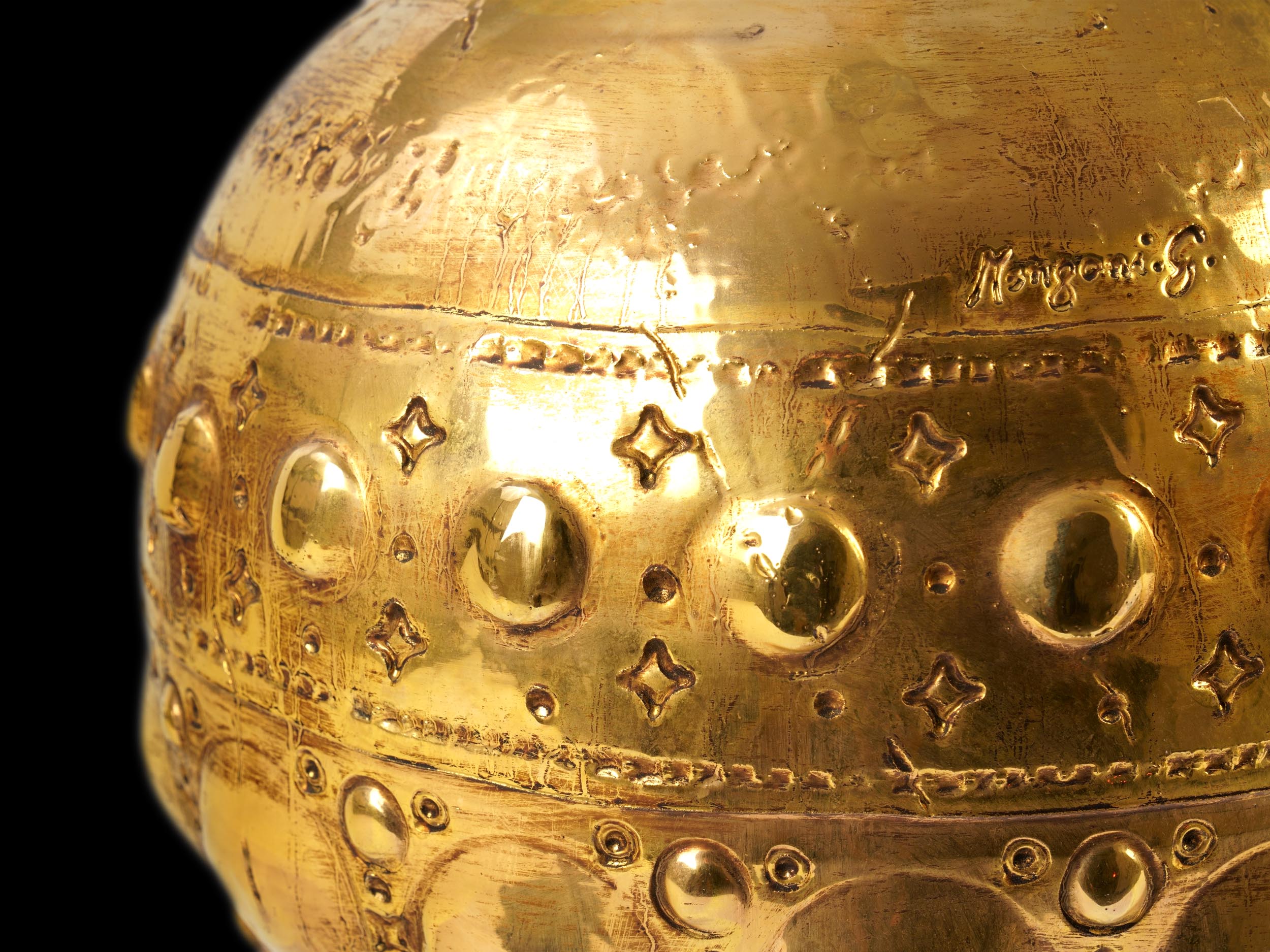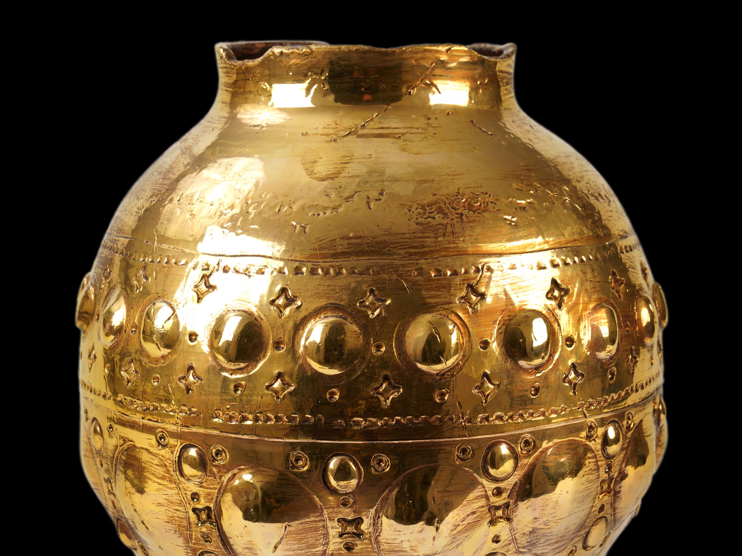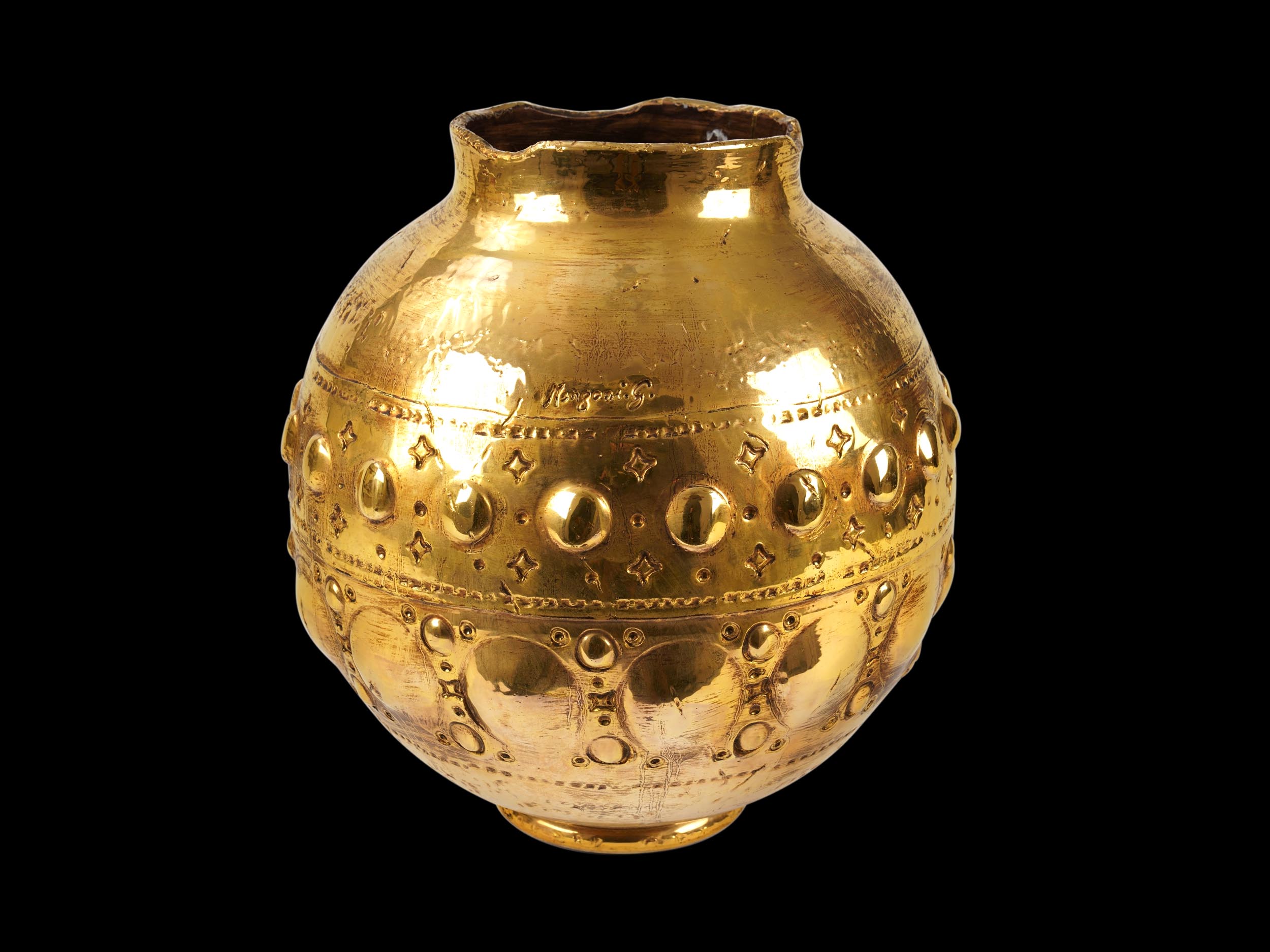 A sculptural vase crafted from red clay sourced from Sansepolcro, Tuscany, hand-thrown into a spherical shape. The central surface features geometric reliefs, spherical motifs, and Renaissance-inspired bas-relief decorations, all individually handcrafted. This piece exemplifies Maestro Mengoni’s unique mastery of the abborchiato embossing technique. The vase is further elevated with a brilliant finish of pure 24kt gold, applied using the terzo fuoco ( third firing) technique. Its surface undergoes a manual antiquing process with a secret natural blend enriched with sandalwood ash. The artist’s signature is engraved into the clay on the visible surface of the vase.