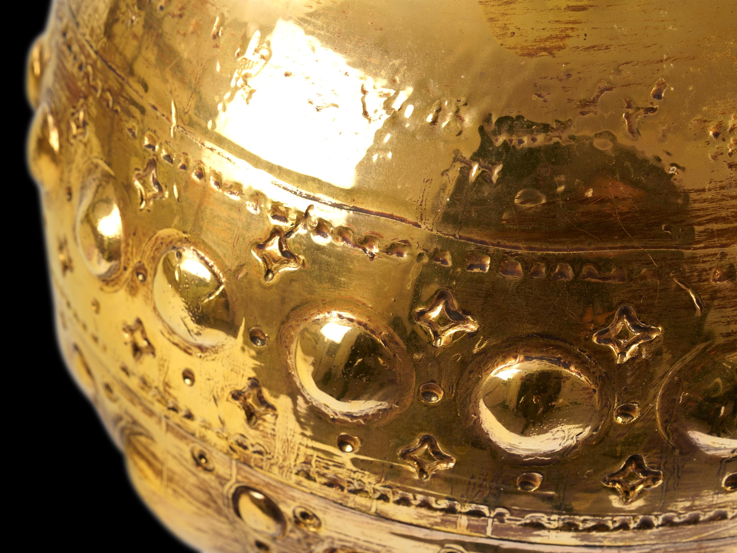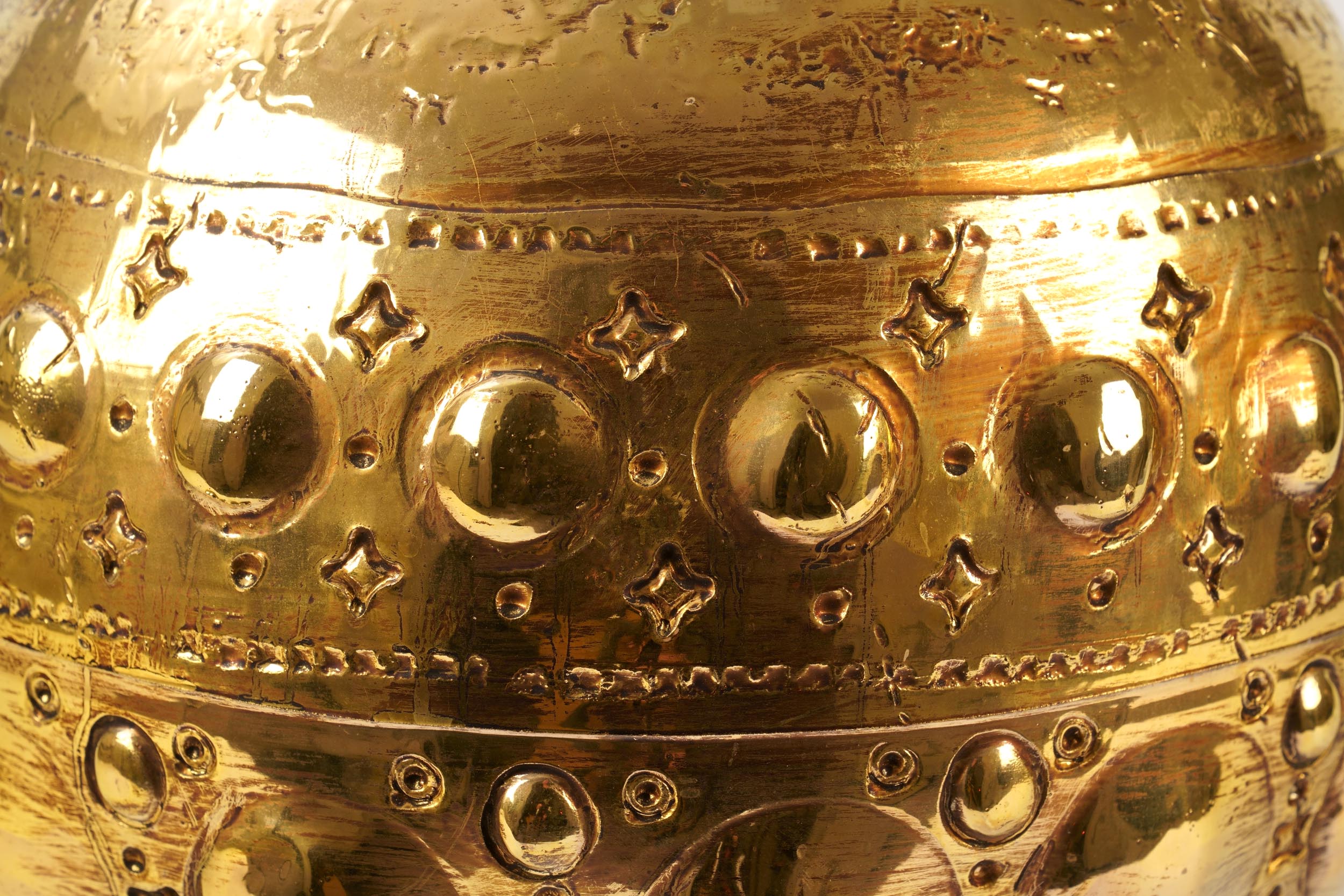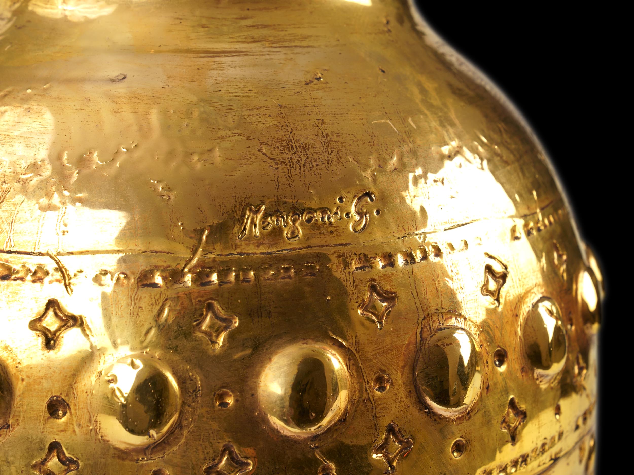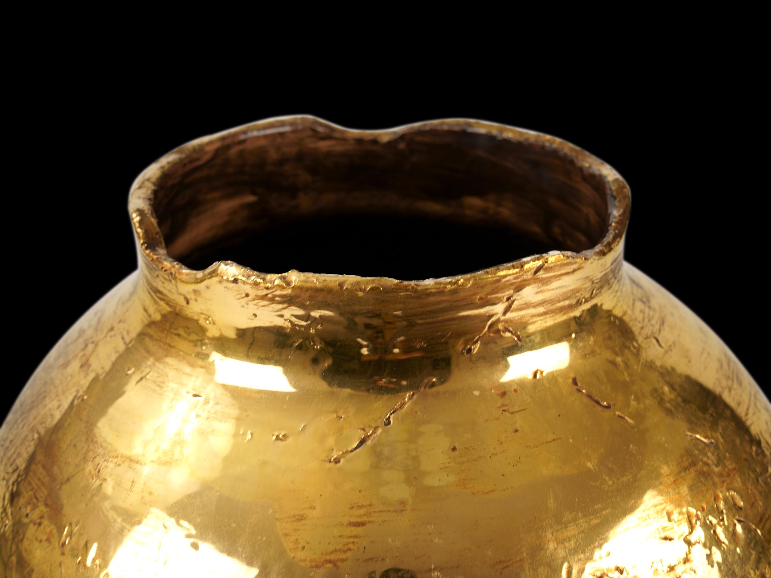 A sculptural vase crafted from red clay sourced from Sansepolcro, Tuscany, hand-thrown into a spherical shape. The central surface features geometric reliefs, spherical motifs, and Renaissance-inspired bas-relief decorations, all individually handcrafted. This piece exemplifies Maestro Mengoni’s unique mastery of the abborchiato embossing technique. The vase is further elevated with a brilliant finish of pure 24kt gold, applied using the terzo fuoco ( third firing) technique. Its surface undergoes a manual antiquing process with a secret natural blend enriched with sandalwood ash. The artist’s signature is engraved into the clay on the visible surface of the vase.