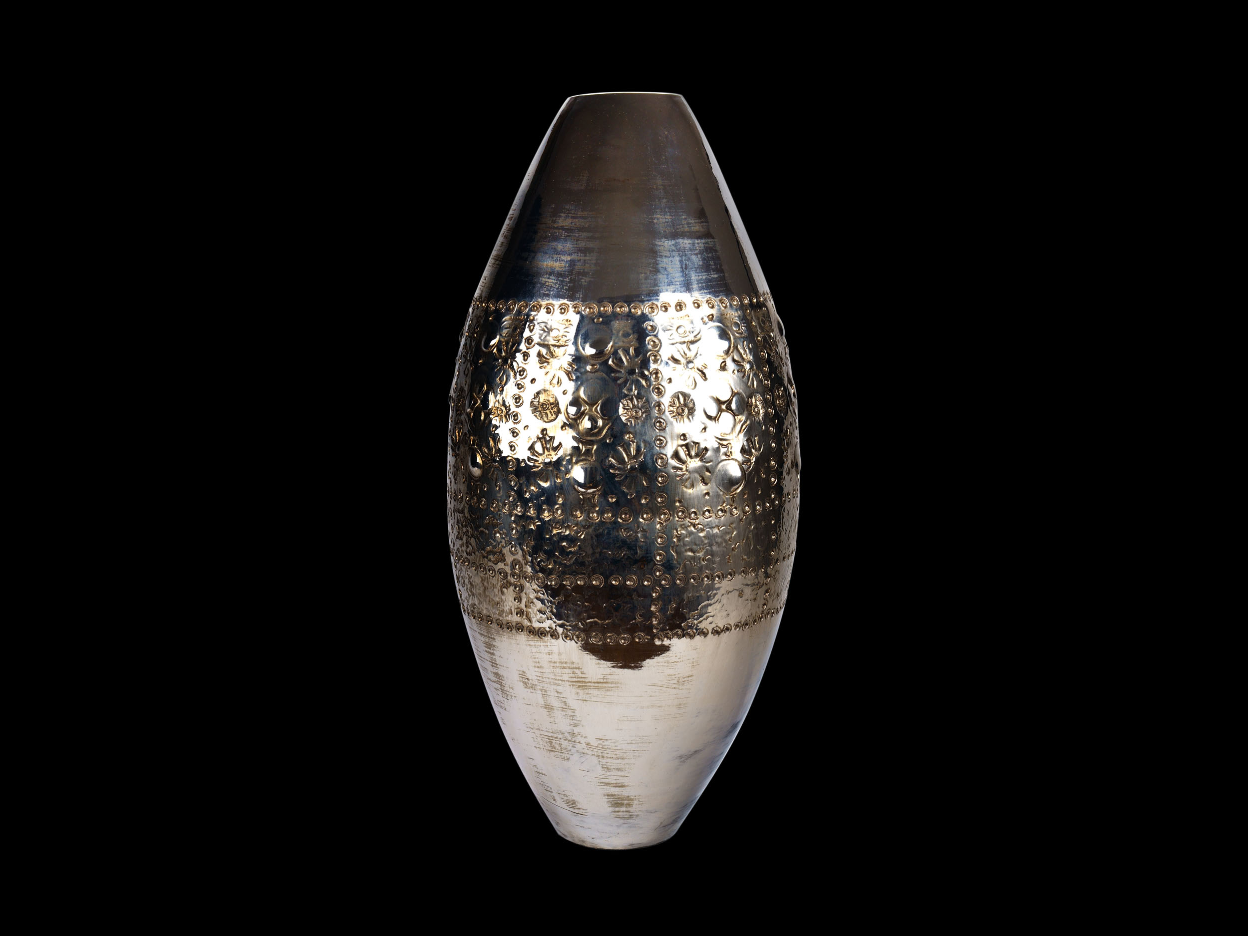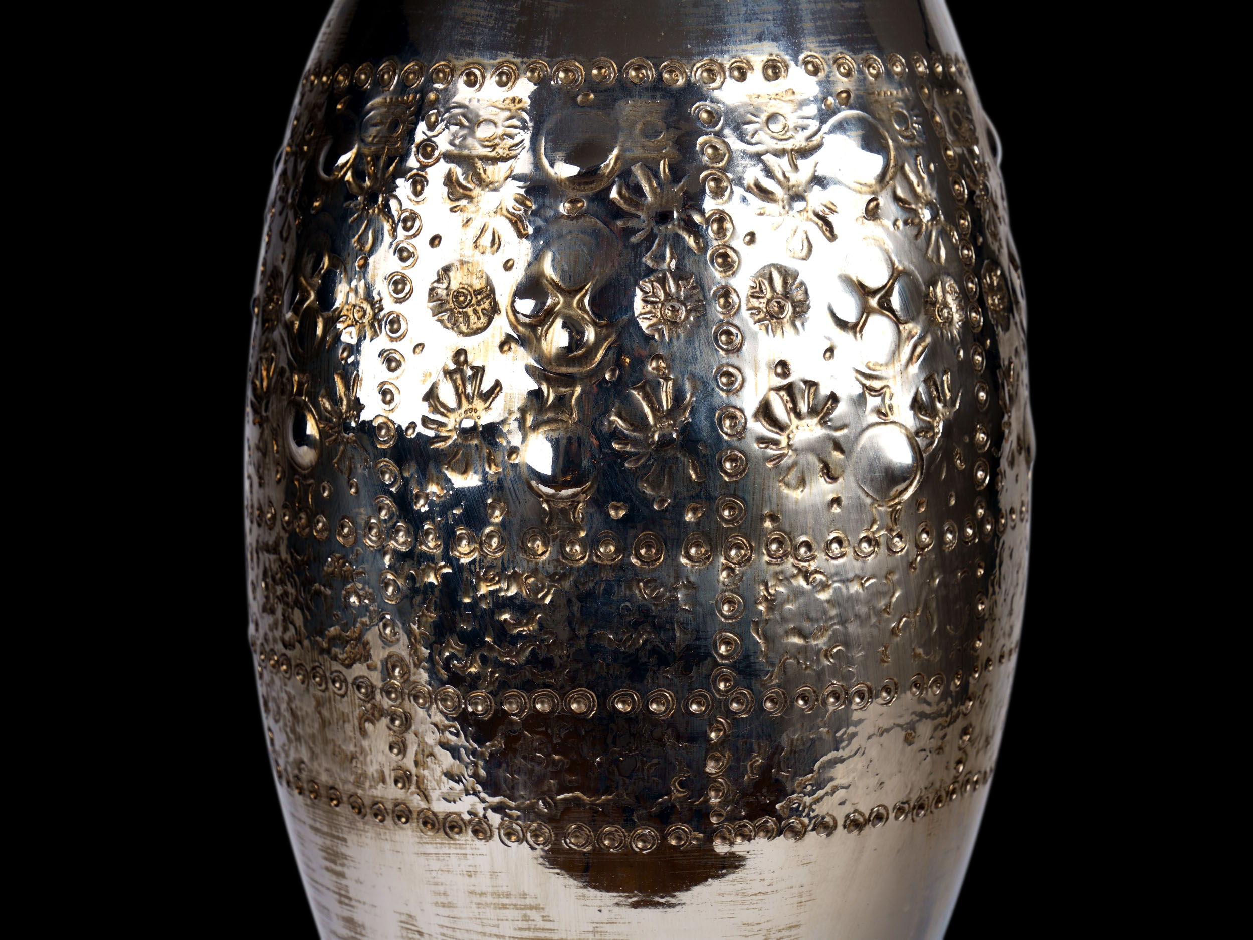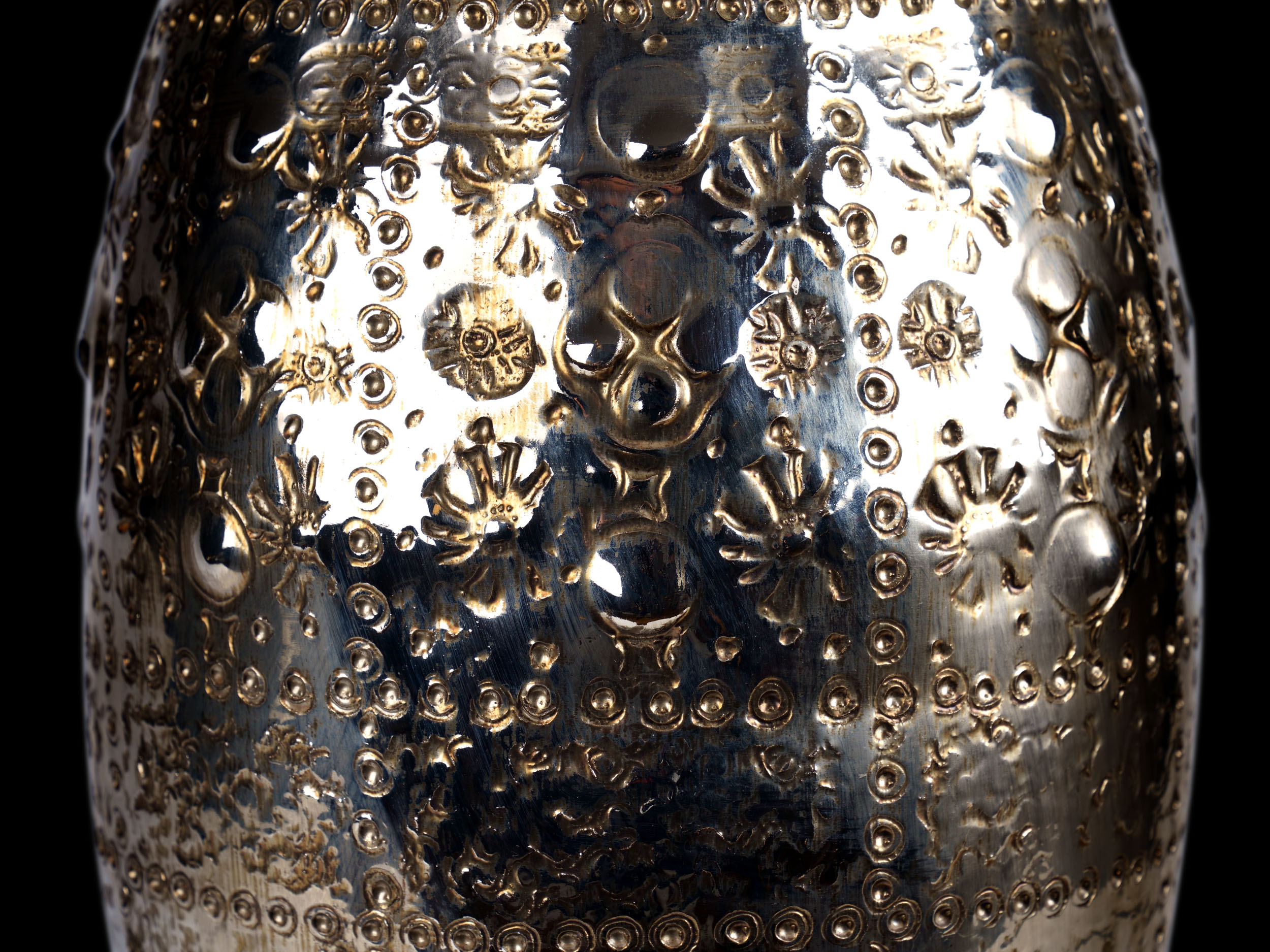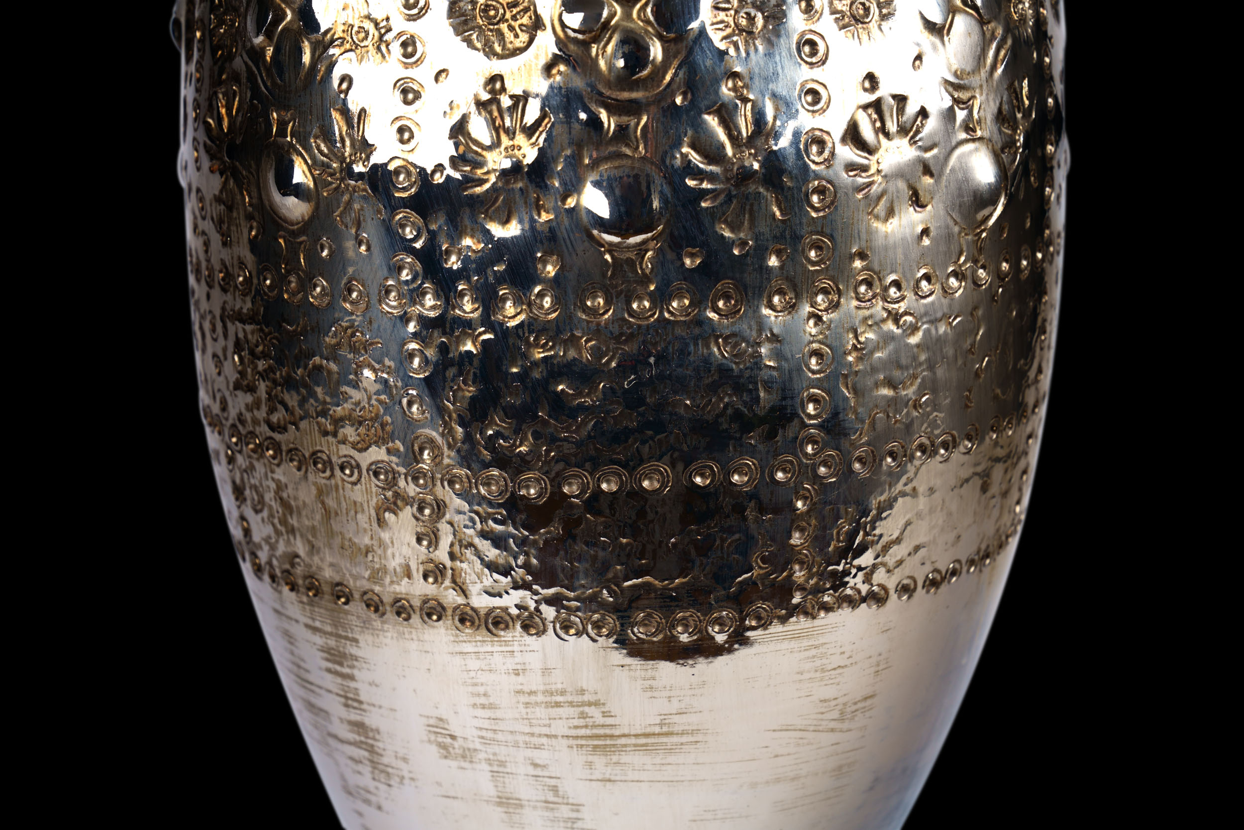 A grand sculptural vase hand-thrown from red clay sourced in Sansepolcro, Tuscany, featuring an elongated and tapered form. The central surface is adorned with geometric reliefs, spherical motifs, and Renaissance-inspired bas-relief decorations, all painstakingly handcrafted. This vase is a remarkable example of Maestro Mengoni’s mastery of the abborchiato technique. The vase is further enriched with a lustrous pure platinum finish, applied using the terzo fuoco (third firing) technique. This finish captures light to create a vibrant and luminous effect. Finally, the surface undergoes a manual antiquing process using a secret natural blend infused with sandalwood ash. The artist’s signature is engraved into the clay on the visible surface of the vase.